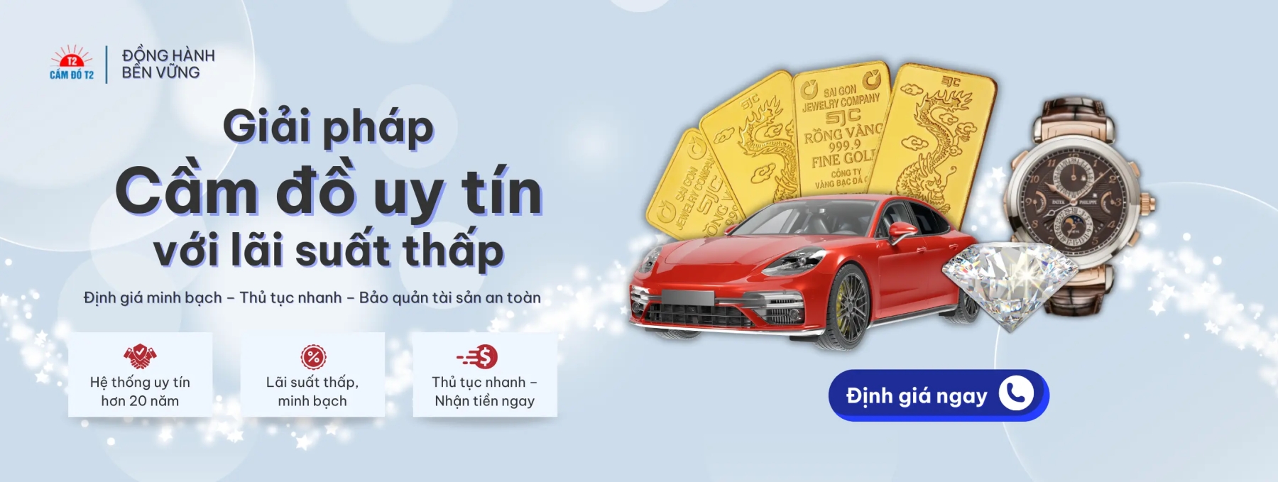 Cầm đồ T2 - Hệ thống cầm đồ uy tín tại TPHCM với thương hiệu hơn 20 năm hoạt động tận tâm. Xuyên suốt nhiều năm hoạt động, chúng tôi đã phục vụ hơn 200,000+ khách hàng cá nhân và doanh nghiệp. Cầm Đồ T2 cam kết sẽ thúc đẩy phát triển mạnh mẽ mang đến dịch vụ cầm đồ: